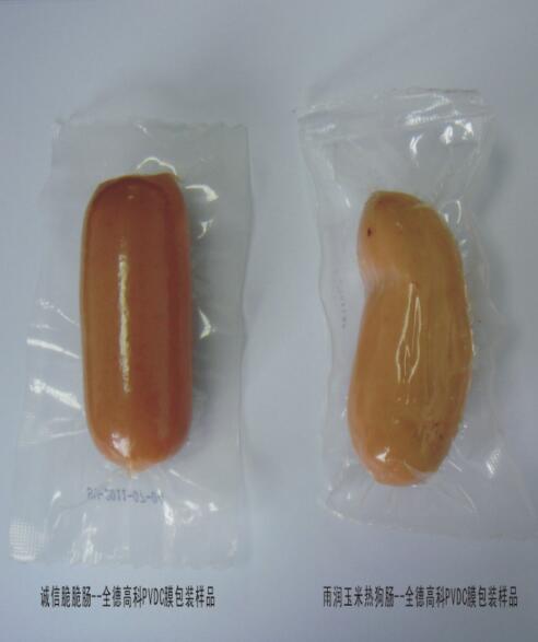 PVDC共挤拉伸膜被誉为肉制品包装中最佳的包装材料。由于肉制品特别是玉米热狗、台湾烤肠、蒜香肠、椰果粒、辣脆肠等对常温保质90天,对肠自身水份、香味的保 持要求及包装时对包材在拉伸浅深度和中高深度的拉伸后阻隔性不下降的要求,只有PVDC共挤拉伸膜才能满足这个要求。