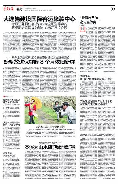本报讯 记者蔡晓华报道 一只梭子蟹被放进看似普通的保鲜膜,历时8个月新鲜度依然不减。4月18日,记者在丹东全德高科技包装有限公司见证了这一保鲜奇迹。