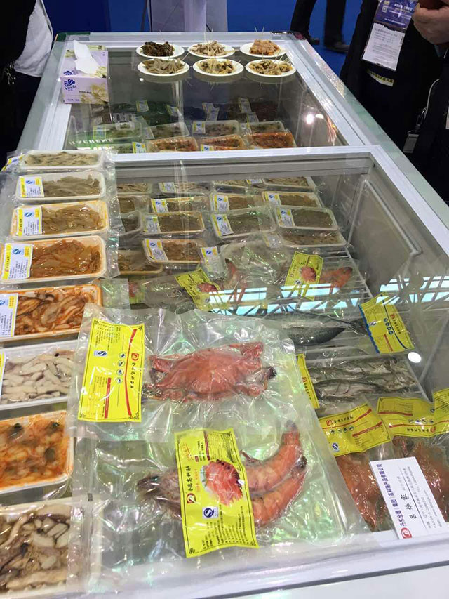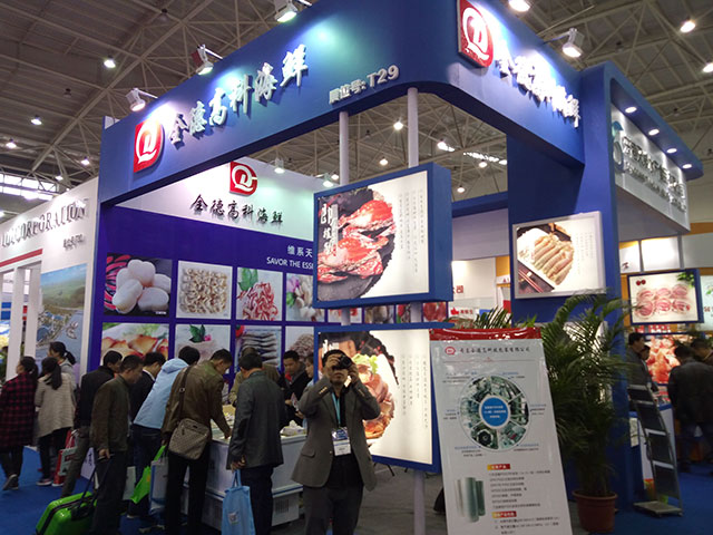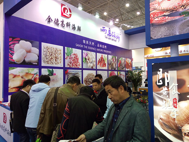 丹东全德高科海产有限公司参加在武汉国际博览中心举办的2016第四届中国食材电商。依托丹东丰富的海洋资源和全德集团投入数亿元自主研发生产的PVDC全阻隔包装材料,在不添加任何添加剂和防腐剂的条件下,保证海鲜新鲜味美,口感鲜嫩,延长保质期。